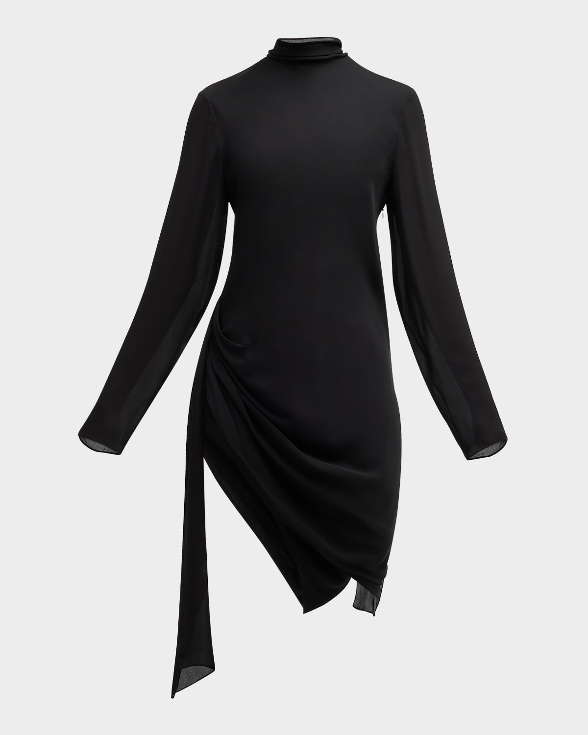 Brandon Maxwell "Raina" dress featuring a draped waist and a scarf neck Mock neckline Long sleeves Sheath silhouette Mini length Asymmetric hem Invisible back zip Silk Made in USA