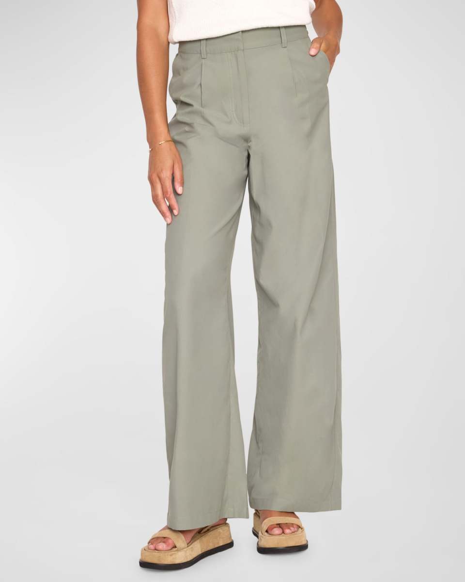 Brochu Walker "Joya" pants with front pleats Approx. measurements: 31.5"L inseam; 43.5"L outseam Highrise sits high on the hips Flat front Side slant pockets Back welt pocket Full length Wide legs Hookandbar/zip fly; belt loops Polyester/cotton Lining: Polyester Dry clean Imported
