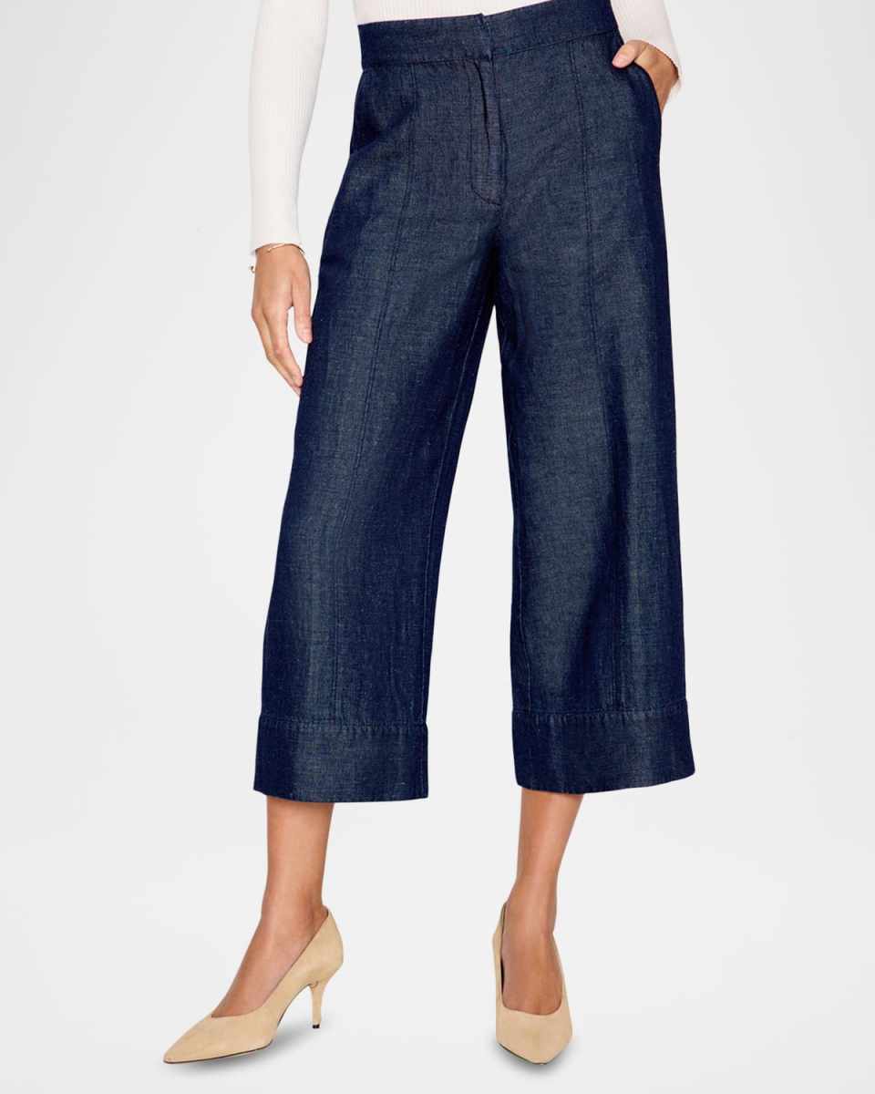 Brochu Walker "Odele" pants in dark wash denim with front pintucks Approx. measurements: 11.5" rise; 25" inseam; 36" outseam Midrise sits high on the hips Partially elasticized waistband Flat front Onseam pockets Back welt pockets Cropped at the ankle Straight legs Zip fly Cotton/linen Lining: Polyester Hand wash Imported
