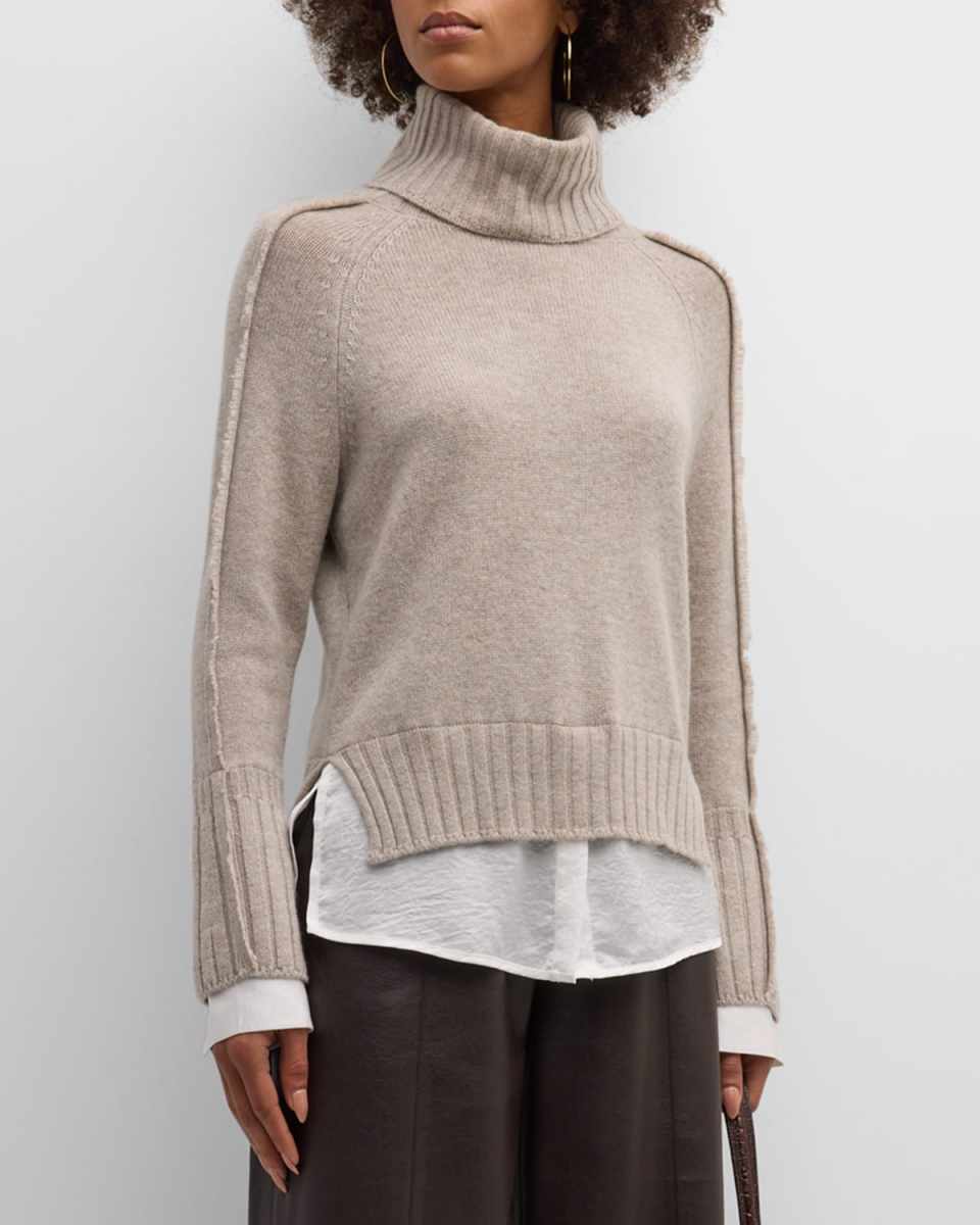 Brochu Walker "The Jolie" layered turtleneck sweater featuring fringe details throughout in a woolcashmere blend Long sleeves; button cuffs Slim fit Rounded split hem Pullover style Wool/cashmere Dry clean Imported