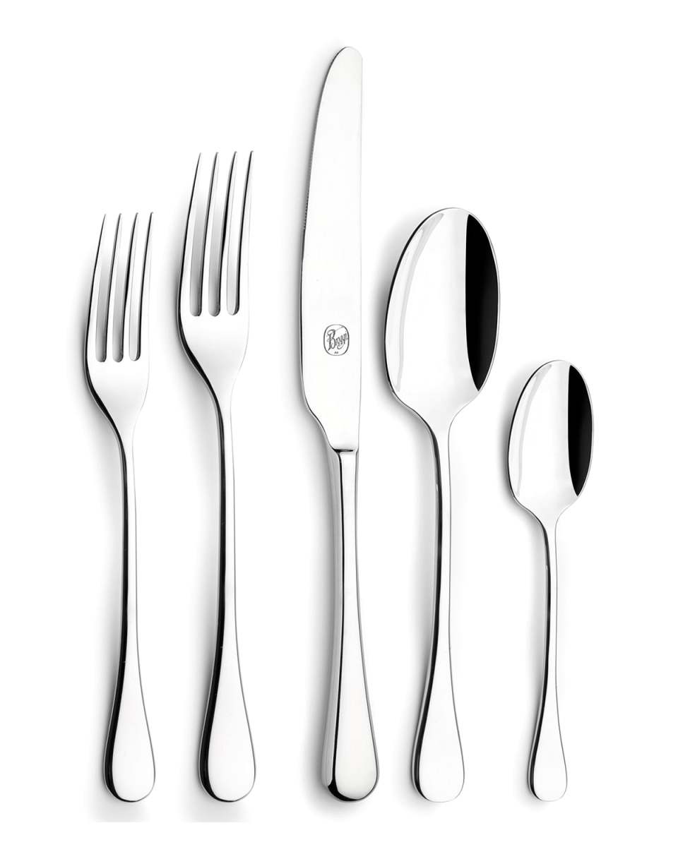 20piece flatware set made of 18/10 stainless steel. Service includes four fivepiece place settings. 200 year old, family owned Italian Factory. Dishwasher safe. Made in Italy.