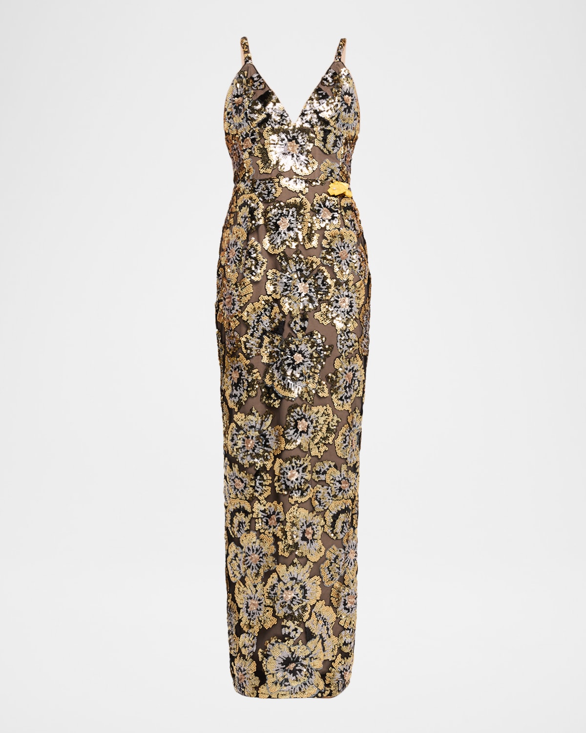 This "Allegra" gown from Bronx and Banco features sparkling sequins, adjustable straps, and a fulllength twoway back zip closure. The column silhouette is designed with a plunging V neckline and an open squared back. Approx. 62"L from shoulder to hem V neckline Adjustable straps Full length Column silhouette Twoway back zip closure Polyester Lining: Polyester/elastane Dry clean Imported
