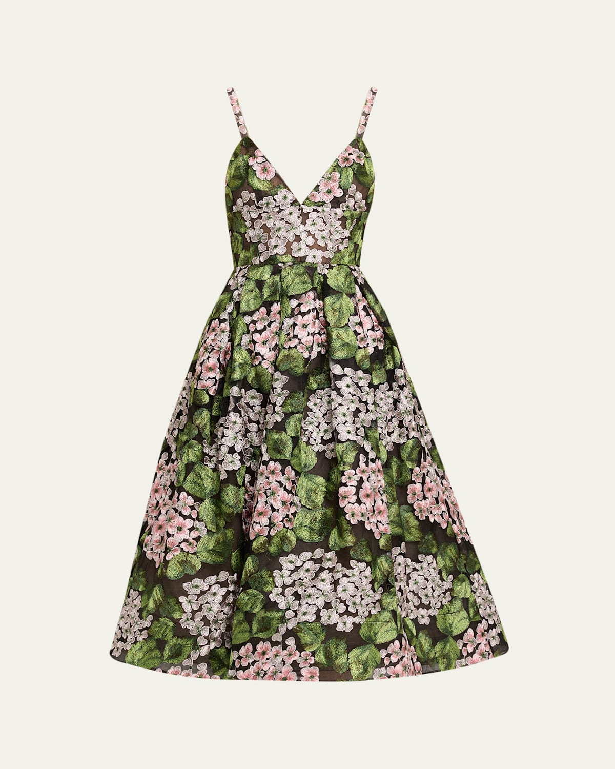 The Bronx and Banco "Eden" midi dress is cut from intricately embroidered mesh, finished with defined box pleats for a voluminous skirt and swaying movement Approx. 50"L from shoulders to hem Deep V neckline Sleeveless Adjustable straps Onseam pockets Hem falls below the knee Aline silhouette Back zipper Polyester Lining: Elastane/polyester Imported