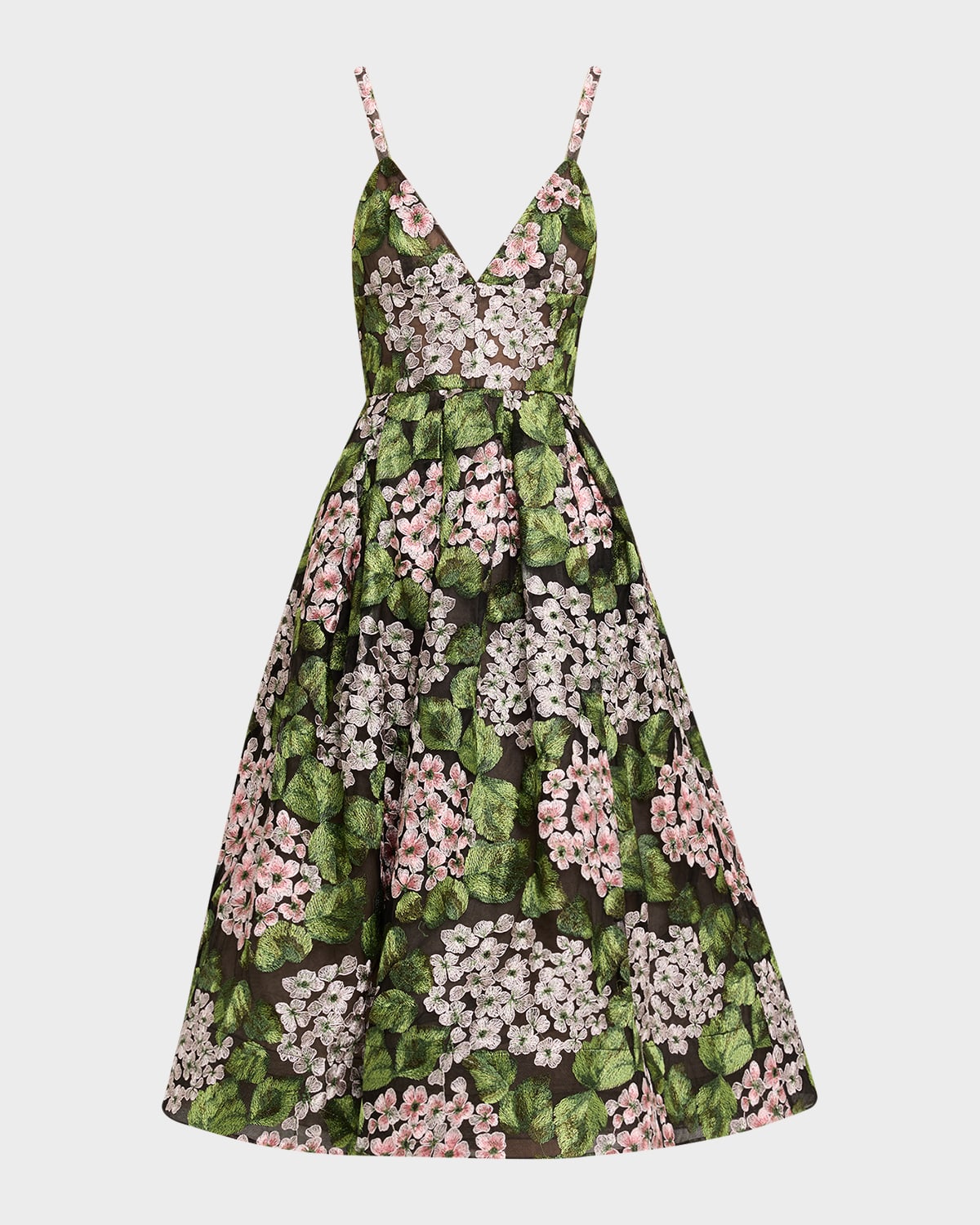 The Bronx and Banco "Eden" midi dress is cut from intricately embroidered mesh, finished with defined box pleats for a voluminous skirt and swaying movement Approx. 50"L from shoulders to hem Deep V neckline Sleeveless Adjustable straps Onseam pockets Hem falls below the knee Aline silhouette Back zipper Polyester Lining: Elastane/polyester Imported