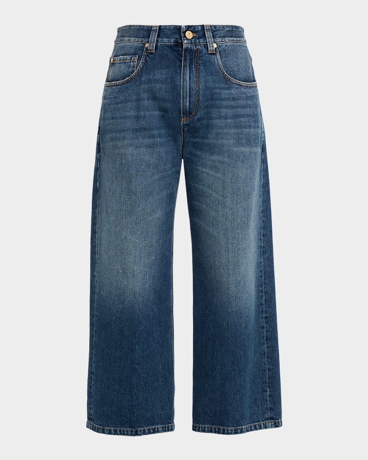 Brunello Cucinelli jeans crafted in a faded medium wash authentic denim featuring a signature monili trimmed belt loop on the back Mid rise sits high on hip Fivepocket style Leather logo patch on the back Wide legs Ankle length Button/zip fly; belt loops Cotton Made in Italy