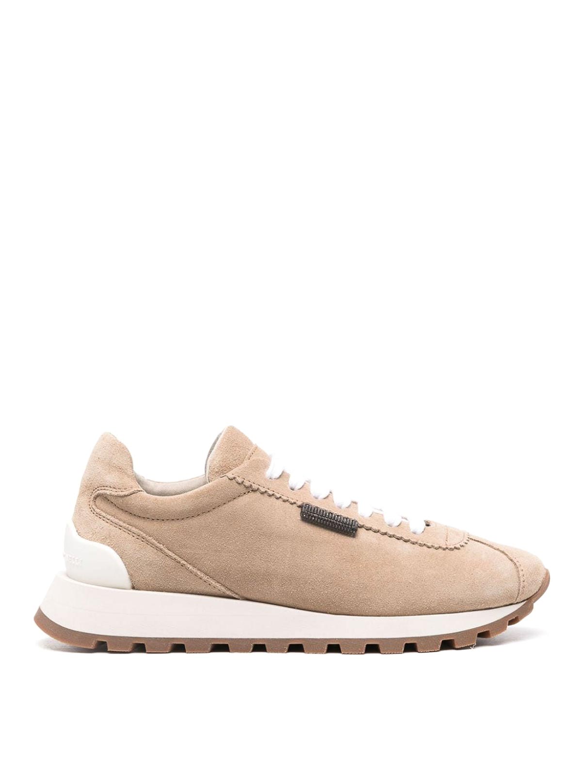 Logo en chaîne Monili emblématique beige à bout en amande, logo en relief gravé sur la languette en dentelle striée, haut