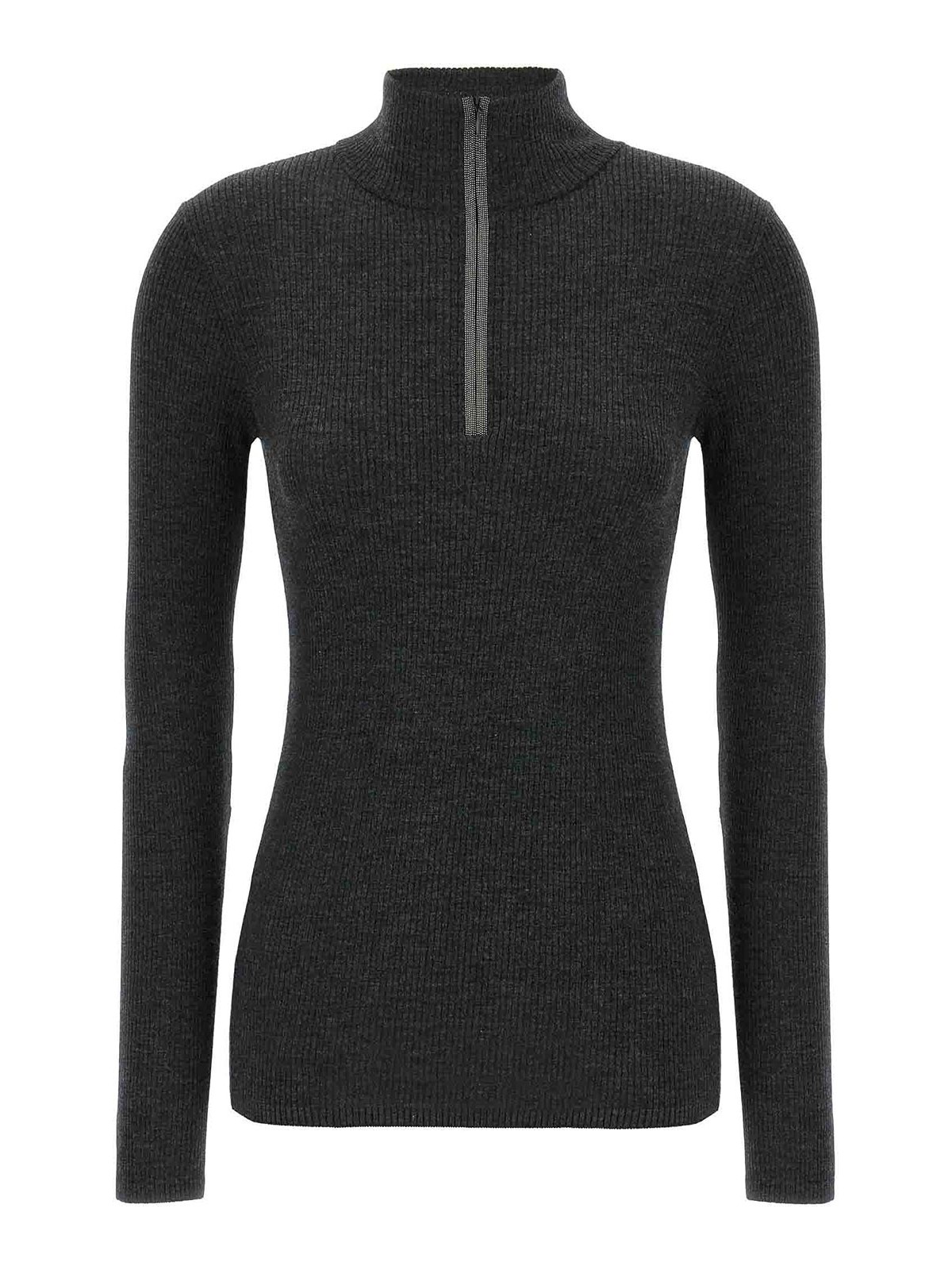 Pull à col roulé côtelé en laine vierge et cachemire stretch, demi-fermeture éclair avec détail en moile et manches longues.