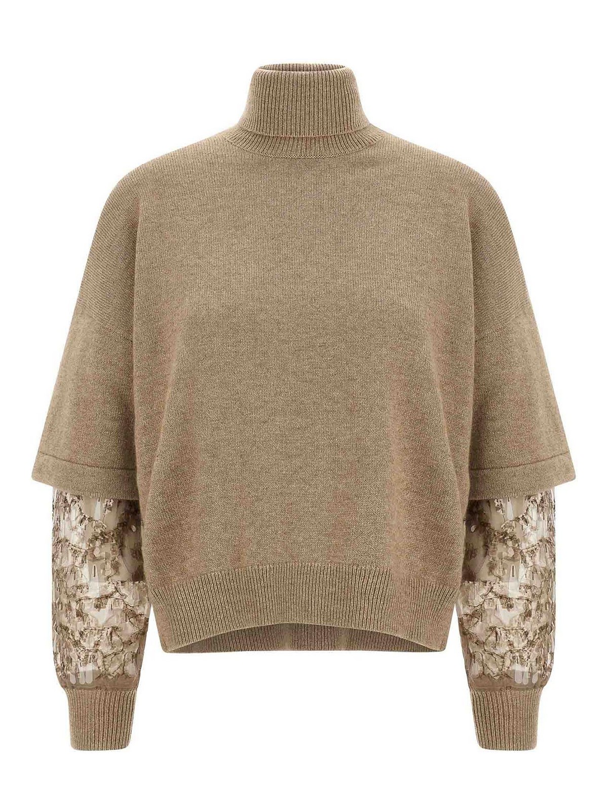 Pull en cachemire à manches longues double couche avec insert en tulle avec sequins et poignets appliqués, col haut.