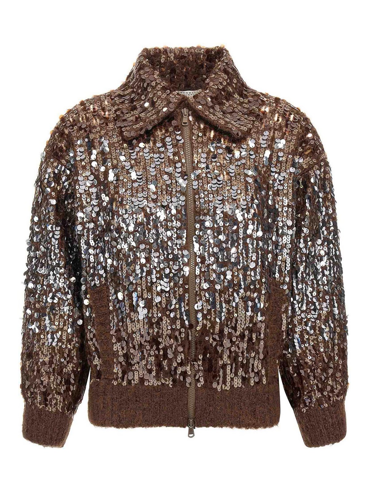 Cardigan en maille et broderies dégradées éblouissant avec col de chemise à sequins appliqués sur l'ensemble, poches zippées, manches longues à revers et épaules tombantes