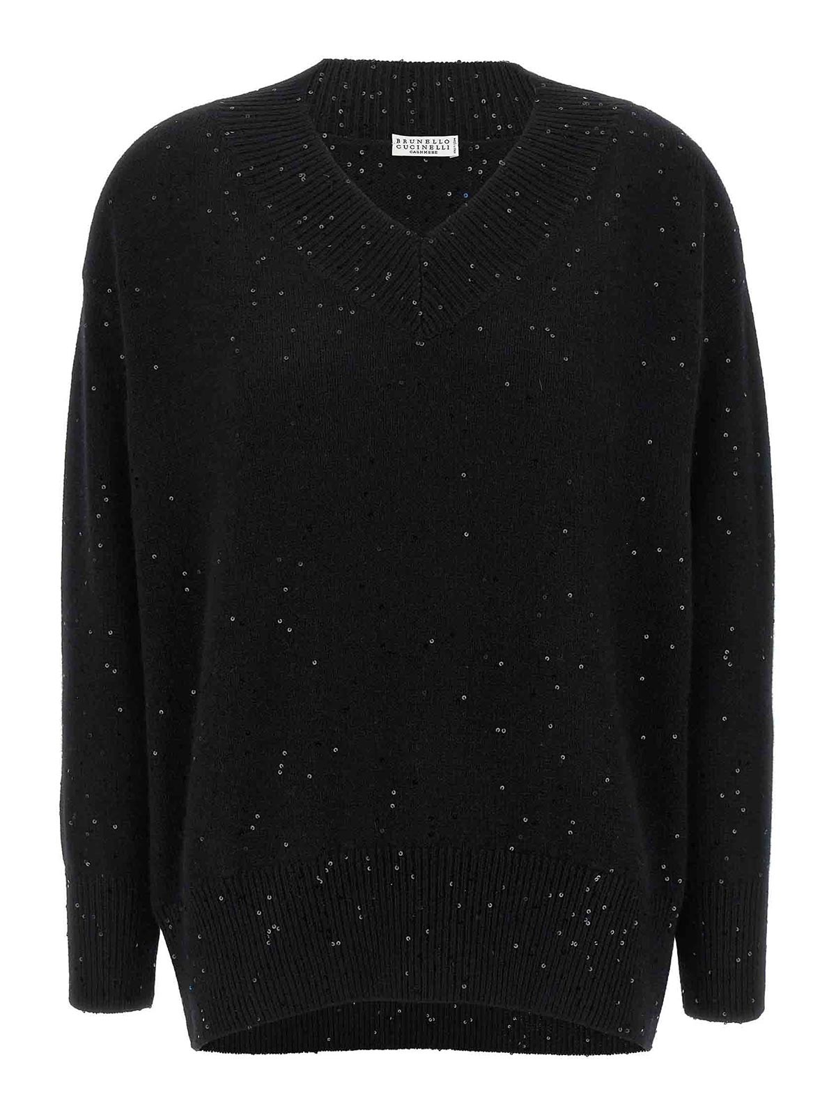 Pull en cachemire et soie avec application de paillettes sur l'ensemble, col en V, manches longues à revers.