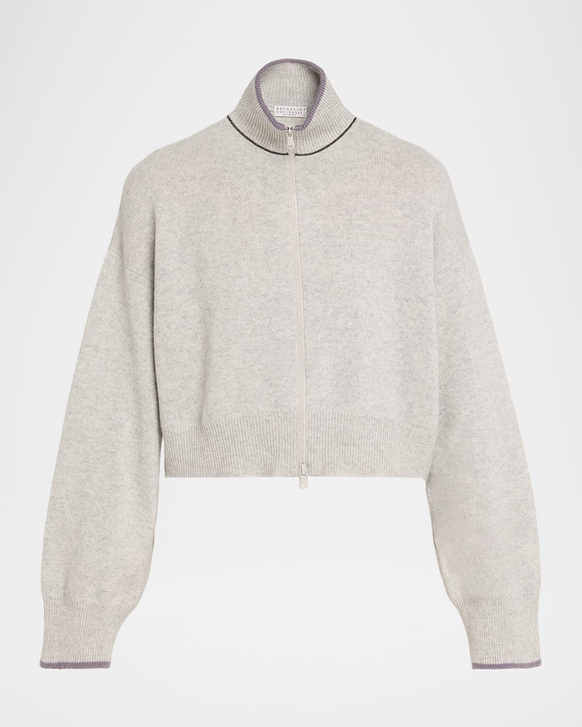 An elevated essential, this Brunello Cucinelli cardigan is crafted of a soft cashmere accented with subtle monili trim, blending luxurious softness with understated refinement. Stand collar; twoway zip front Long sleeves Loose fit Cropped length Ribbed cuffs and hem Cashmere Dry clean Made in Italy