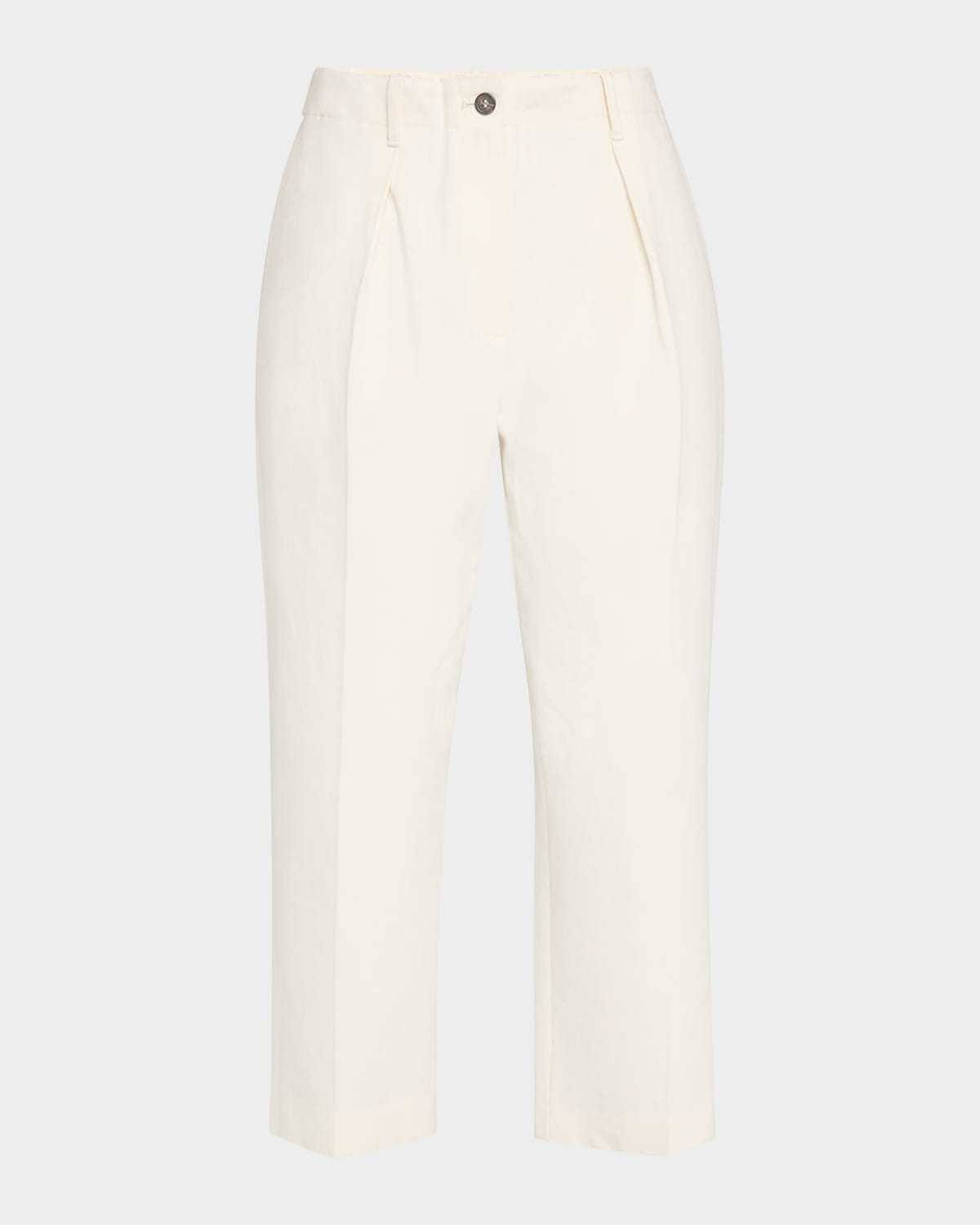 Brunello Cucinelli creased square chino pants Cropped fit Mid rise sits high on hip Straight legs Side slip pockets; back flapbuttoned pockets Button/zip fly; belt loops Cotton/wool/polyester Lining: Polyester/acetate Made in Italy