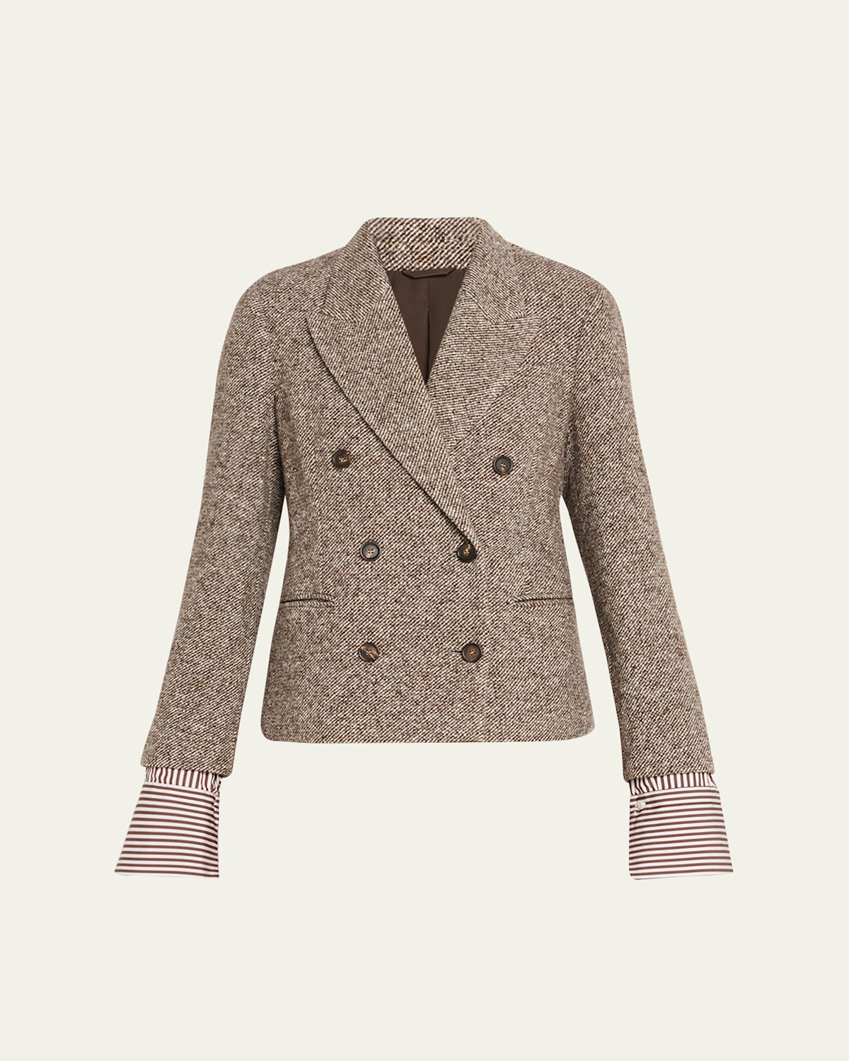 Brunello Cucinelli diagonal tweed wool blazer Peak lapels; doublebreasted front Padded shoulders Long sleeves with removable cuffs Hip besom pockets Midlength Virgin wool/silk/nylon/polyamide Lining: Acetate/silk/polyester Dry clean Made in Italy