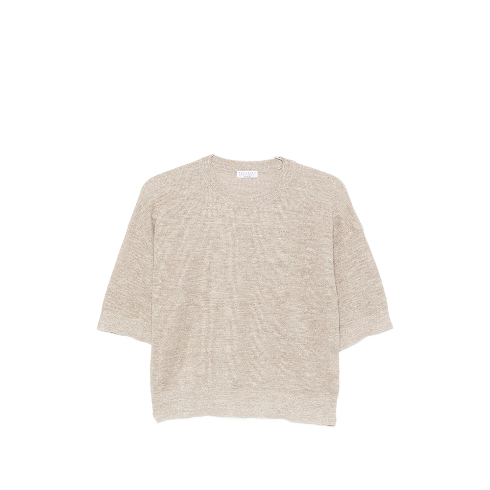 beige fine knit crew neck short sleeves dropped shoulders ribbed trims