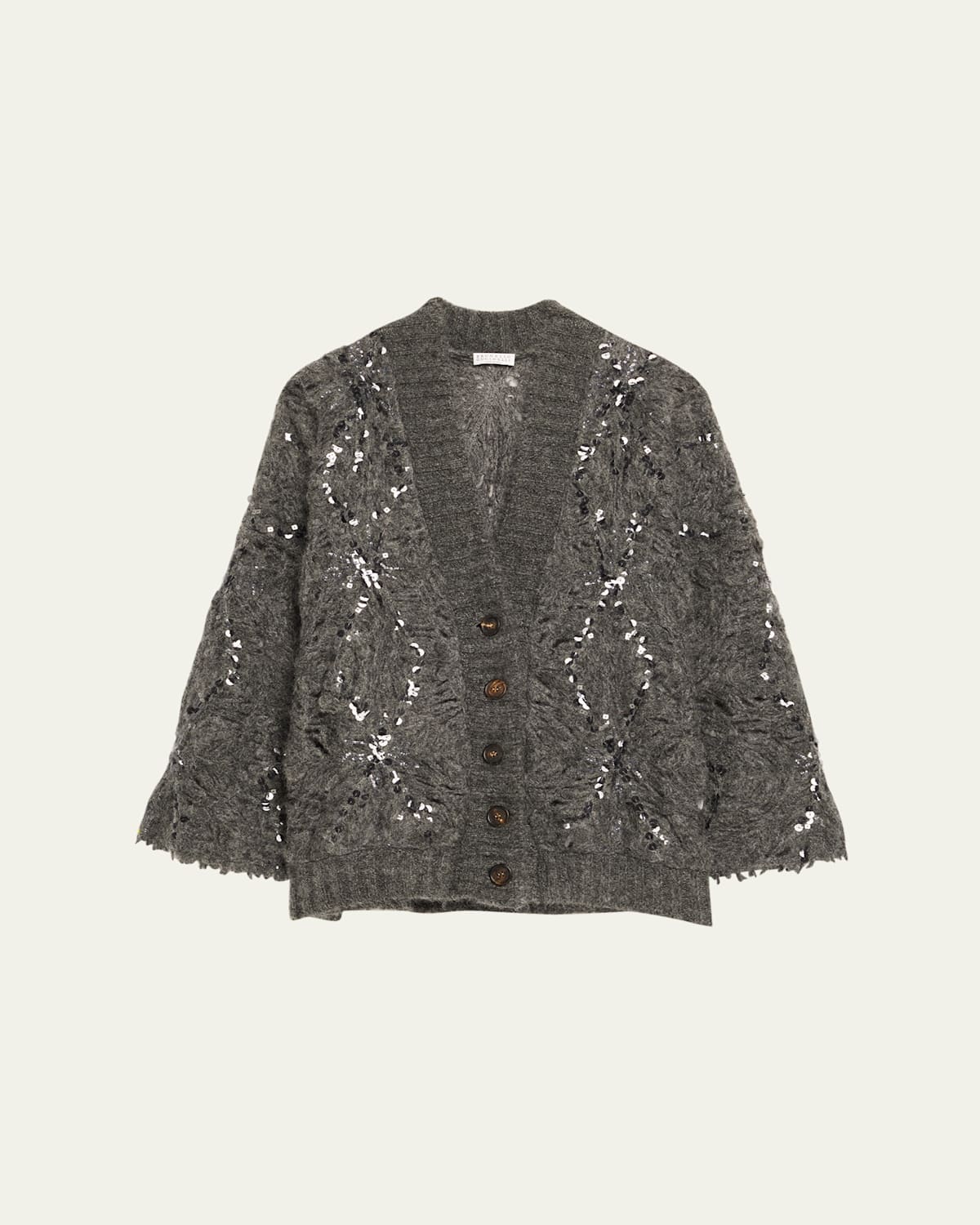 Brunello Cucinelli cardigan crafted in an airy woolcashmere open knit, embellished with frosty arfyle sequin embroidery V neckline; button front Long sleeves Drop shoulders Oversized fit Ribbed hem Cashmere/wool/nylon/polyamide Dry clean Made in Italy