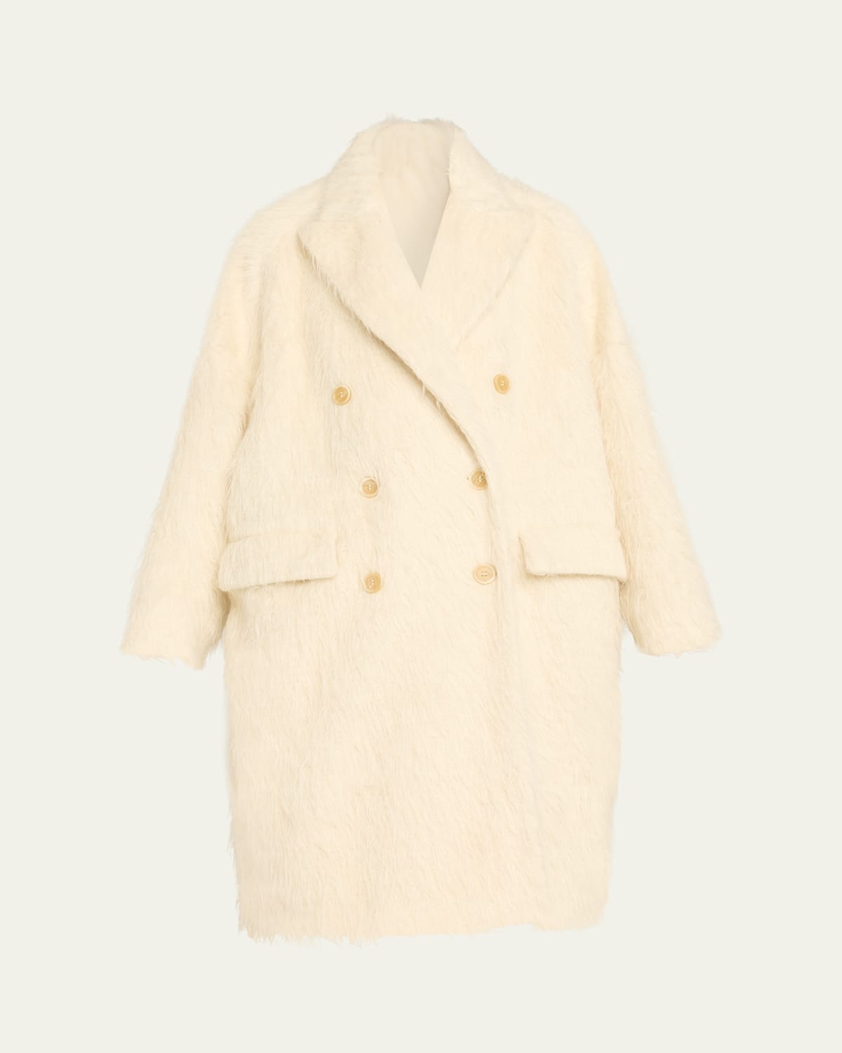 Brunello Cucinelli overcoat that feels like a luxe embrace, crafted in a fuzzy alpacablend that adds both warmth and texture. Peak lapels; doublebreasted front Long sleeves Drop shoulders Hip flap pockets Oversized fit Hem falls below the knee Animal hair/polyester Lining: Polyester/acetate/silk Dry clean Made in Italy
