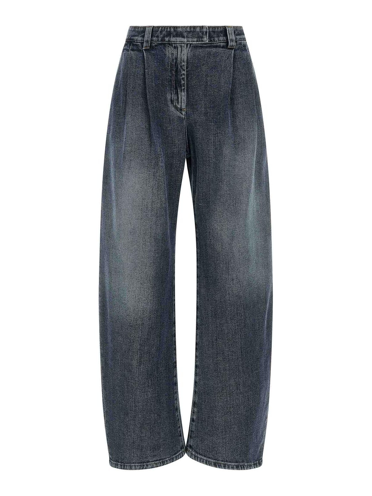 jean confortable en denim de coton à effet vintage « ample et incurvé », à double pli, jambe large à silhouette incurvée, fermeture à glissière et fermeture à bouton sur le devant, et détail en forme de monile au dos.