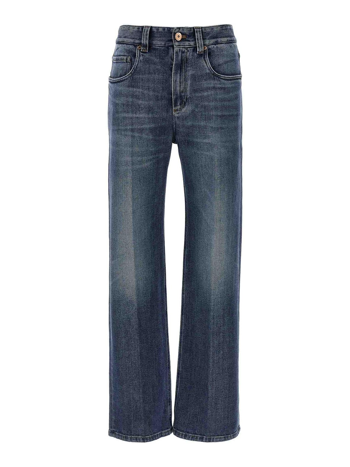 jean en jean léger en coton délavé contemporain avec jambe large et droite à effet usé, fermeture zippée et boutonnée sur le devant, cinq poches, détail monile et étiquette logo en cuir à l'arrière.