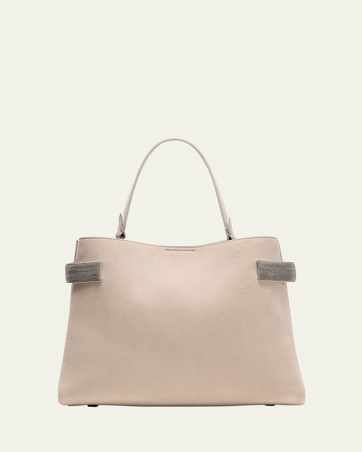 Brunello Cucinelli eastwest tote bag in suede and leather Flat top handle Detachable, adjustable crossbody strap Can be worn as a top handle or crossbody bag Open top with magnetic closure Side monili strap closure Feet protect bottom of bag Approx. 9.8"H x 12.9"W x 5.1"D Made in Italy