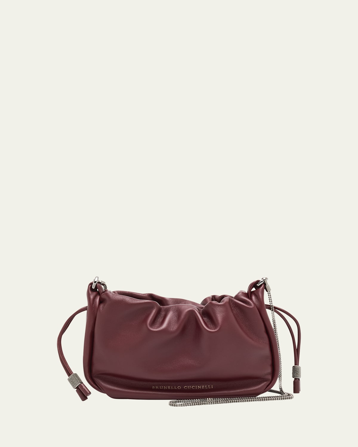 Brunello Cucinelli "Mellow" ruched bucket bag in calfskin leather, crafted in a soft and compact silhouette with minimalist lines Monili shoulder strap Drawstring closure with monili accents Interior, one card slot Suede lining Approx. 5.5"H x 10.2"W x 2.6"D Made in Italy