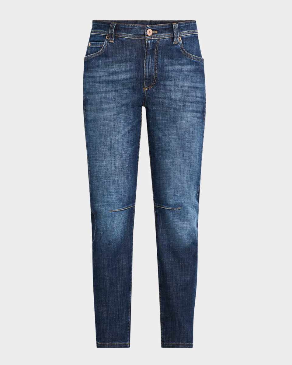 Brunello Cucinelli equestrian jeans in faded dark wash denim with knee darts Mid rise sits high on hip Fivepocket style Skinny legs Cropped at the ankle Button/zip fly; belt loops Cotton/elastane Made in Italy