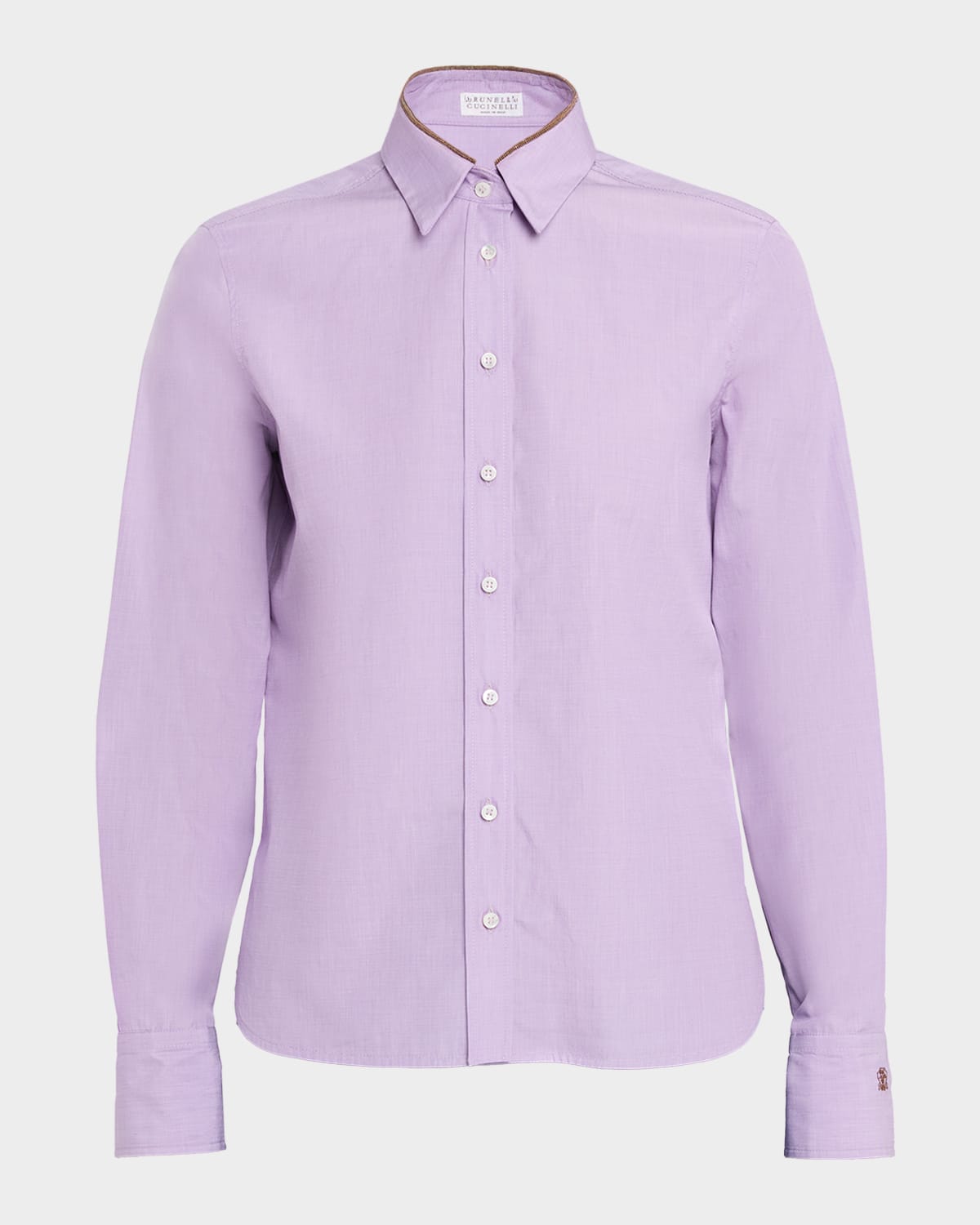 Brunello Cucinelli shirt crafted of cotton chambray features a signature monili embellished collar and a crest embroidered cuff Point collar; button front Long sleeves; button cuffs Yoked back; box pleat Relaxed fit Shirttail hem Cotton Made in Italy