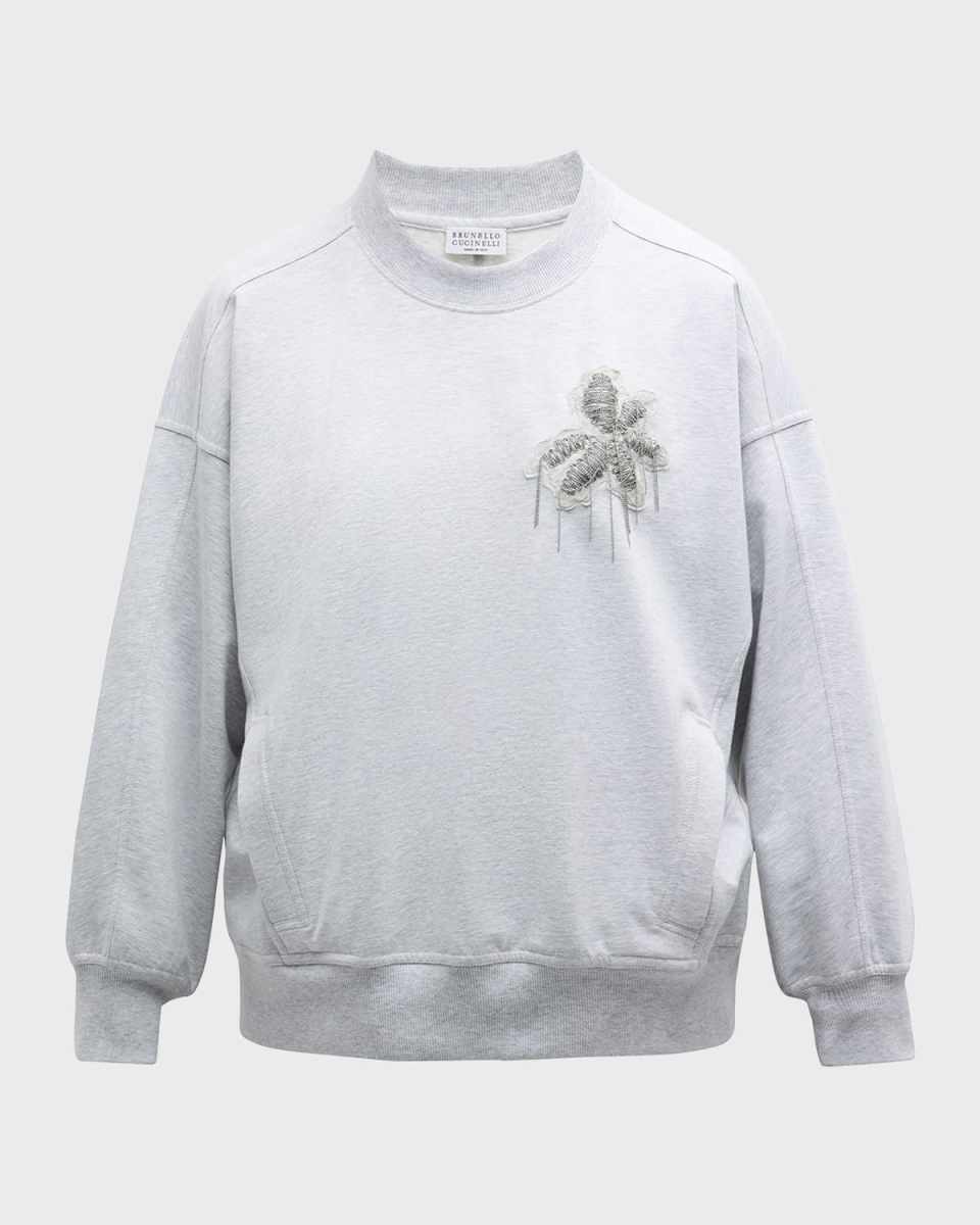 Brunello Cucinelli cotton felpa sweatshirt featuring a monili floral crest embroidered chest Crew neckline Long sleeves Side welt pockets Loose fit Ribbed cuffs and hem Pullover style Cotton/elastane Made in Italy