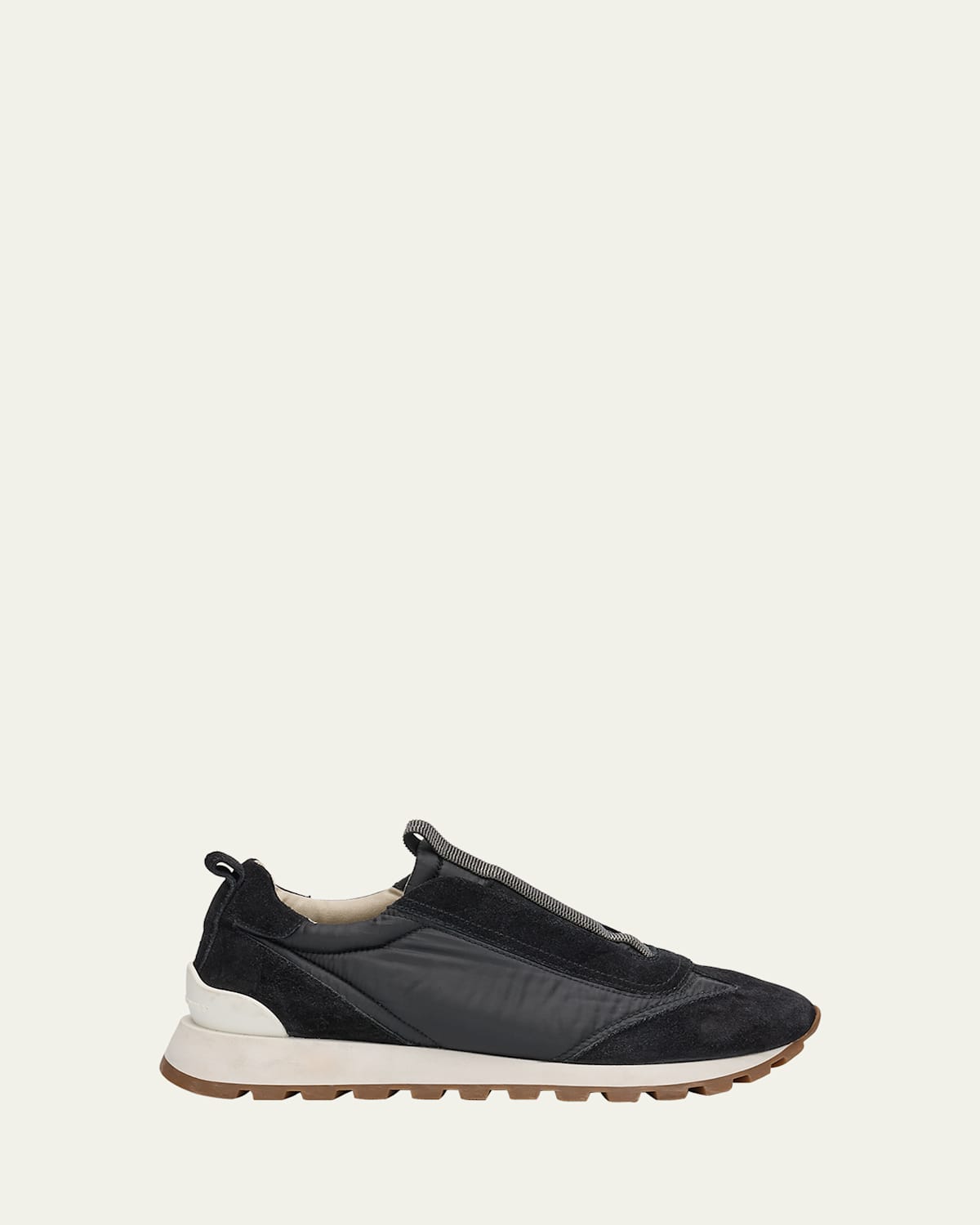 Brunello Cucinelli sneakers in leather, polyester, cotton, and elastane 0.75 in / 20 mm flat heel Reinforced round toe Monili laceless vamp Pulltab on tongue and heeltab Slipon style Lining: Cotton/polyester/leather Rubber outsole Made in Italy