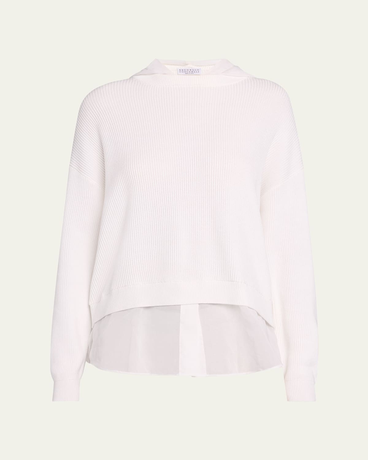 Brunello Cucinelli shirt in ribbed knit and organza combo Hooded neckline Long sleeves; ribbed cuffs Shirttail hem Pullover style Cotton Made in Italy