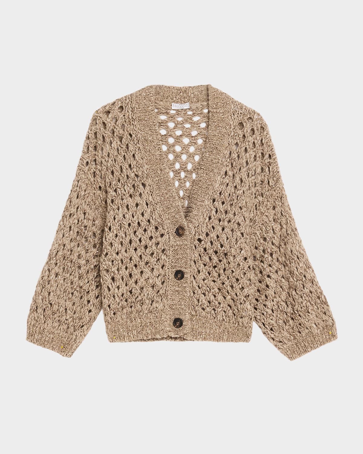 This Brunello Cucinelli cardigan is knit in a shimmer yarn, the open stitches allowing for comfortable crossseasonal wear, while the wool blend adds warmth and softness Complete with large horn buttons for a refined finish V neckline Threebutton front Drop shoulders Long sleeves Oversized fit Wool/cashmere/mohair Dry clean Made in Italy