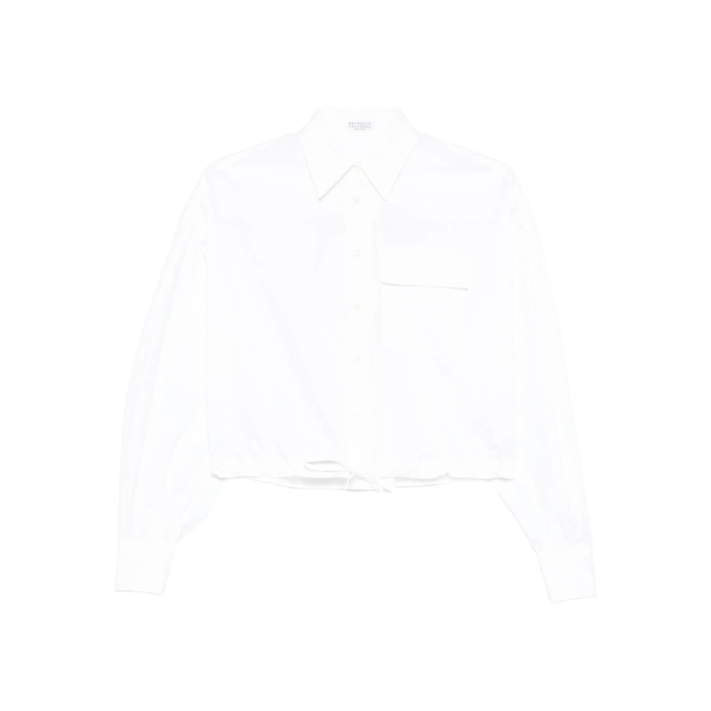 white chest pocket drawstring hem button fastening long sleeves buttoned cuffs