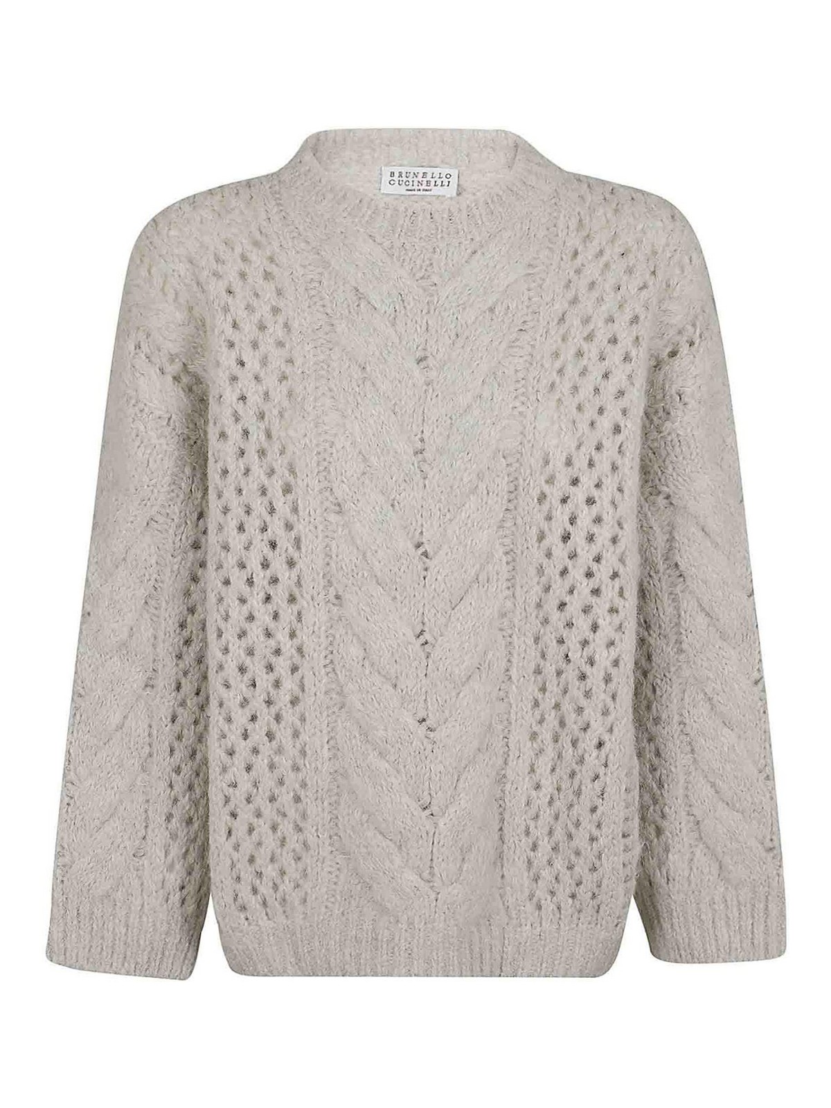 Pull en laine mélangée de Brunello Cucinelli, col rond et profils longs avec élastique côtelé, design à épaules tombantes, coupe douce, tricot tressé et perforé