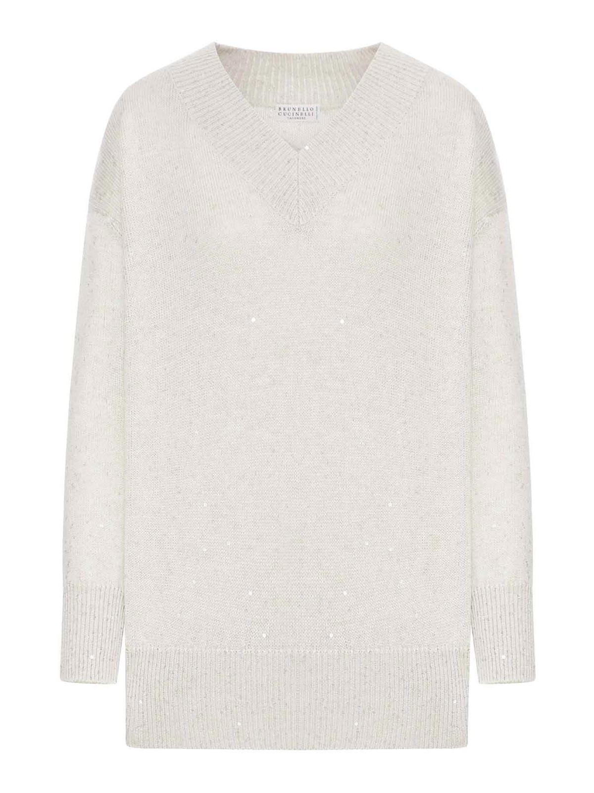 Encolure en V, ourlets et col côtelés, sequins, madreperla surdimensionnée