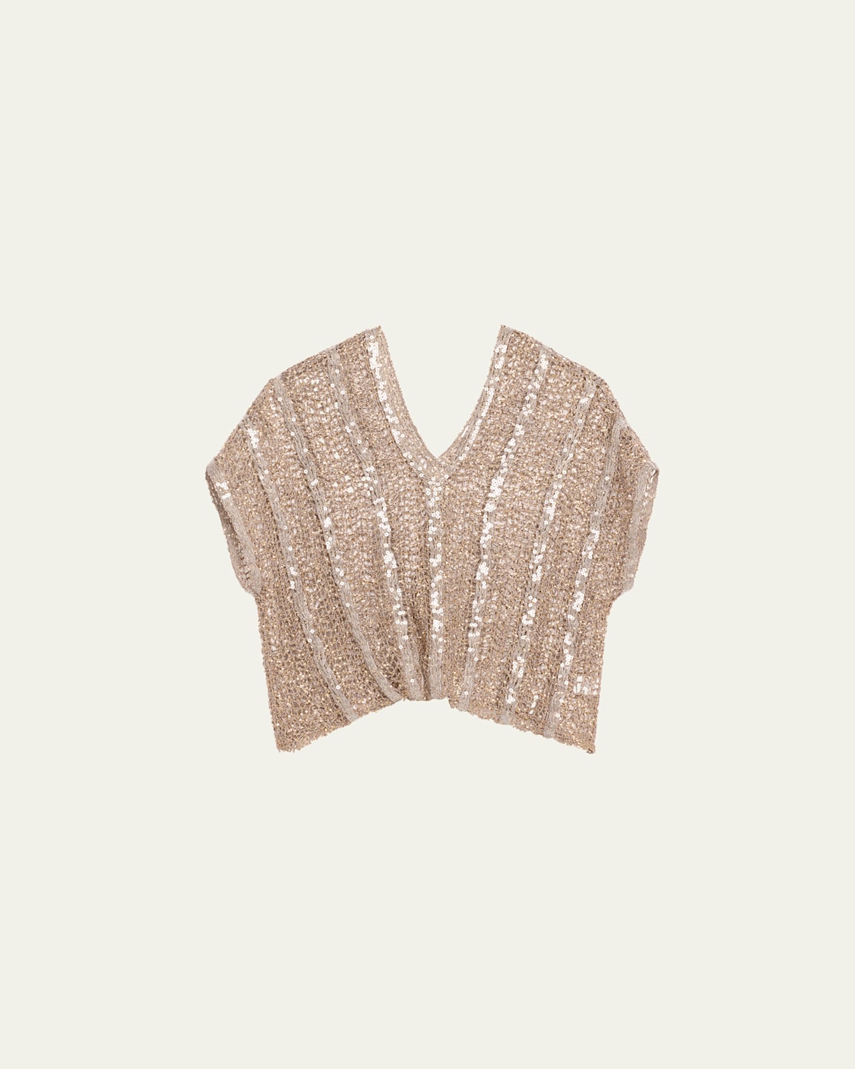 Brunello Cucinelli raffianetted knit sweater top features paillette embroidered details throughout Vneckline Short sleeves Hip length Relaxed fit Pullover style Nylon/polyamide/polyester Lining: Cotton/elastane Made in Italy