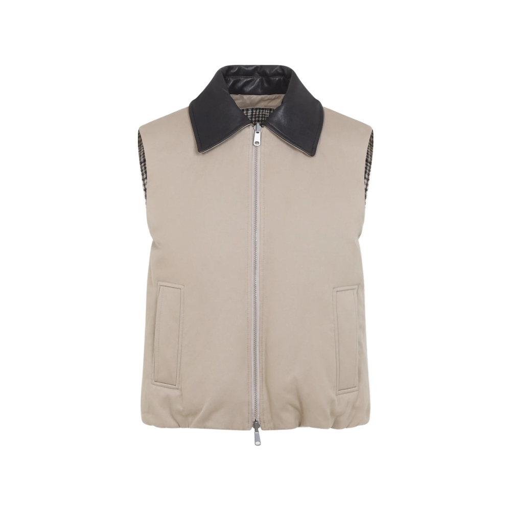 tobacco brown reversible design check pattern spread collar front zip-fastening sleeveless two side welt-pockets elasticated hem