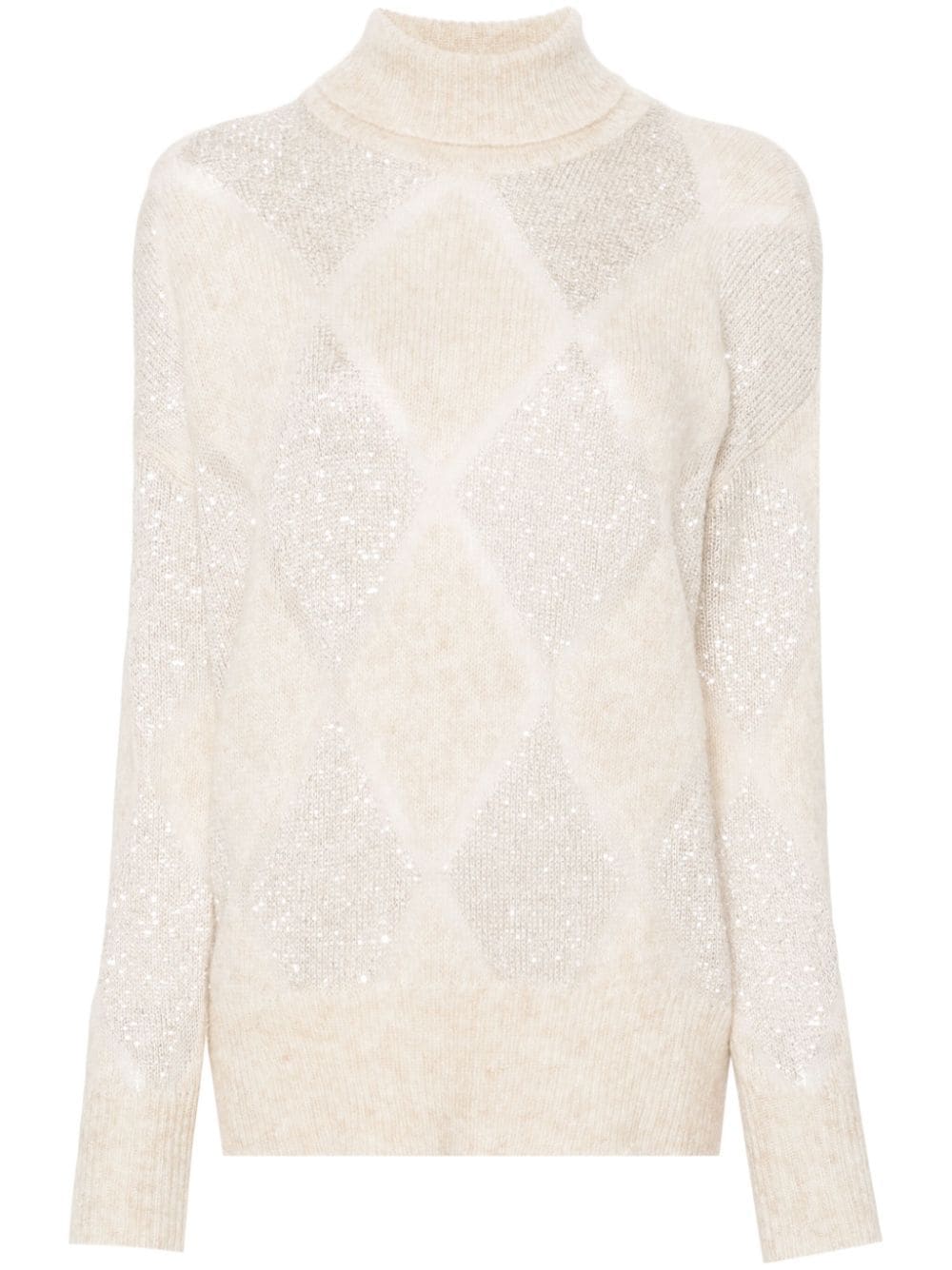beige wool-mohair blend knitted construction brushed effect sequin embellishment roll neck drop shoulder long sleeves ribbed cuffs and hem straight hem