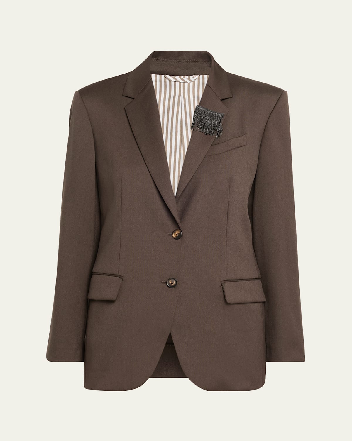 Brunello Cucinelli combed mohair wool blazer with signature monili accent Notched lapels Singlebreasted front Long sleeves Chest welt pocket Hip flap pockets Tailored fit Cutaway hem Twobutton front Virgin wool/mohair Lining: Acetate/cupro/silk Dry clean Made in Italy