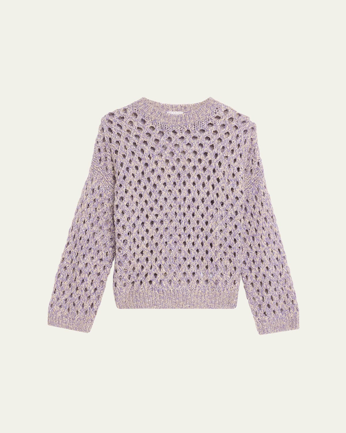 Crafted from a cashmere blend with a hint of sparkle, this sweater by Brunello Cucinelli features an openknit construction Crew neckline Dropped shoulders Long sleeves Ribbed cuffs and hem Relaxed fit Hip length Pullover style Wool/cashmere/mohair Dry clean Made in Italy