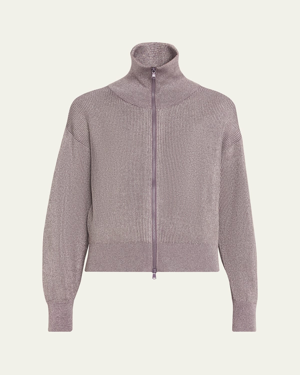 Crafted from a sparkly ribbed knit, this Brunello Cucinelli jacket adds a touch of glamour to your wardrobe. Stand collar Dropped shoulders Long sleeves Relaxed fit Twoway zipfront Cotton/viscose/metallic fibers Dry clean Made in Italy