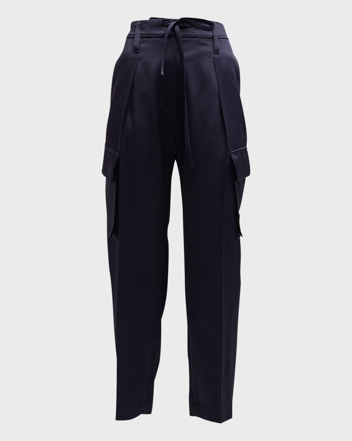 Brunello Cucinelli satin cargo pants featuring Monili trimmed belt loop and an elasticized drawstring waistband Midrise; sits high on hip Pleated front Side slip pockets; back welt pockets Straight legs Cropped at the ankle Hook/zip fly; belt loops Acetate/viscose/silk Made in Italy