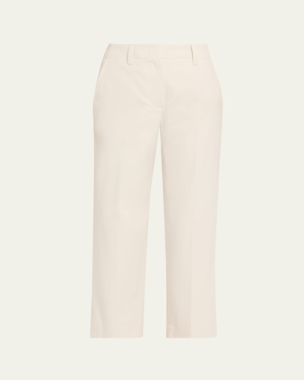 Crafted from stretch cotton, these trousers by Brunello Cucinelli are finished with legelongating front pintucks Midrise sits high on hip Slanted side pockets Cropped fit Straight legs Hidden hook/zip fly; belt loops Cotton/elastane Lining: Polyester/acetate Dry clean Made in Italy