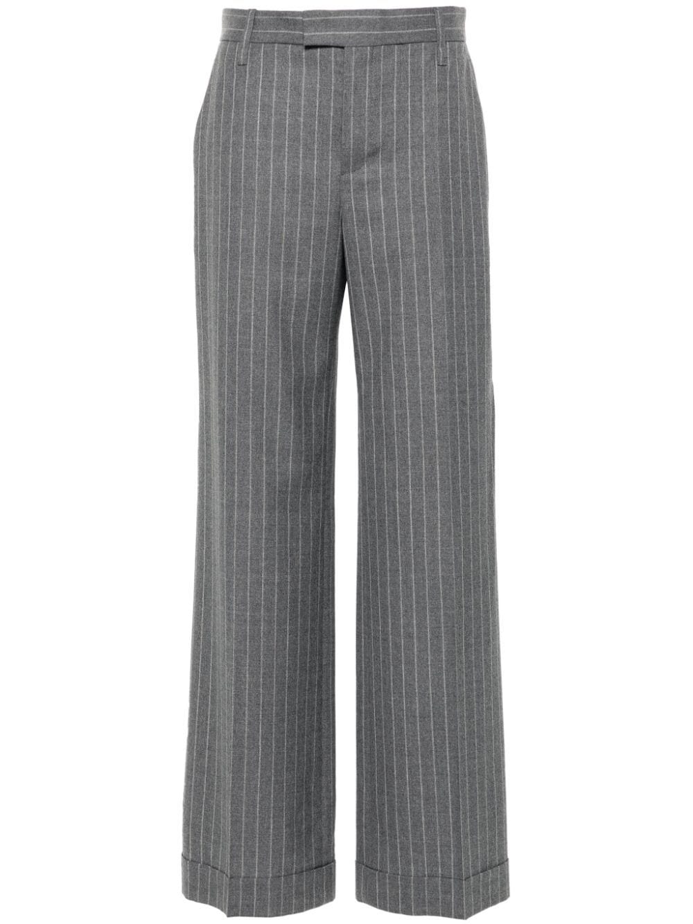 medium grey virgin wool interlock twill weave vertical stripe pattern signature Monili chain detail pressed crease mid-rise concealed front button, hook and zip fastening belt loops two side slash pockets two rear welt pockets straight leg turn-up hem