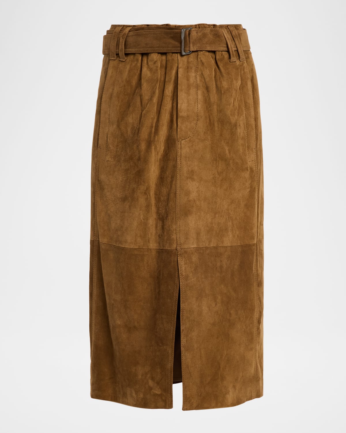 A refined blend of elegance and artisanal heritage, this Brunello Cucinelli skirt is exquisitely crafted from supple lambskin suede and accented by a matching belt and signature Monilibead details Highrise waistband Sideentry pockets Centercut front slit eases movement Hem hits around the knee Skirt falls straight from hip to hem Button/zip fly; belt loops Leather Made in Italy