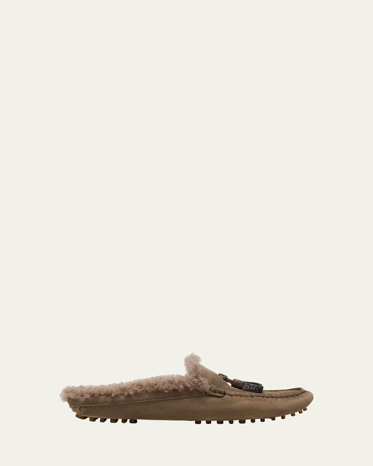 Brunello Cucinelli suede driver loafer mules with monili tassels and dyed shearling (Italy) trim Flat heel Round moc toe Notched vamp Easy slide style Rubber pod outsole Lining: Shearling Made in Italy