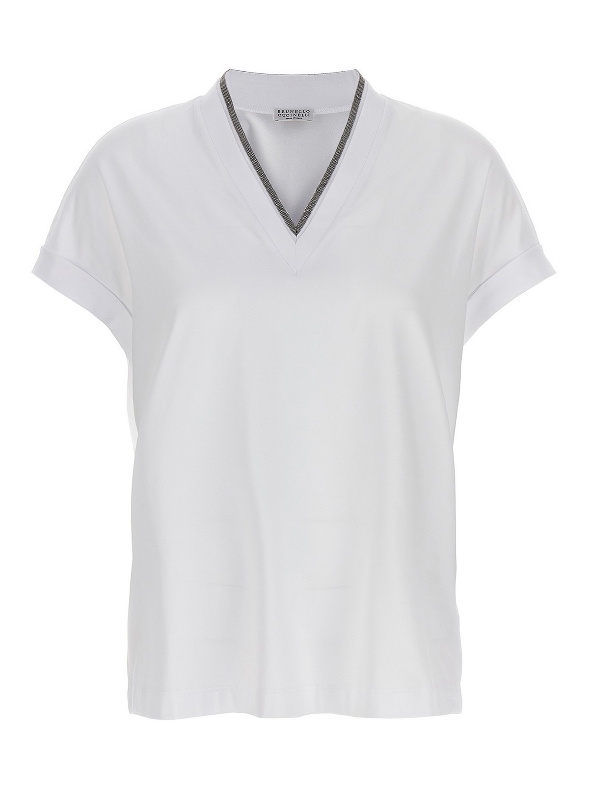 T-shirt à col en V en coton avec détail monile sur le col et manches courtes retroussées
