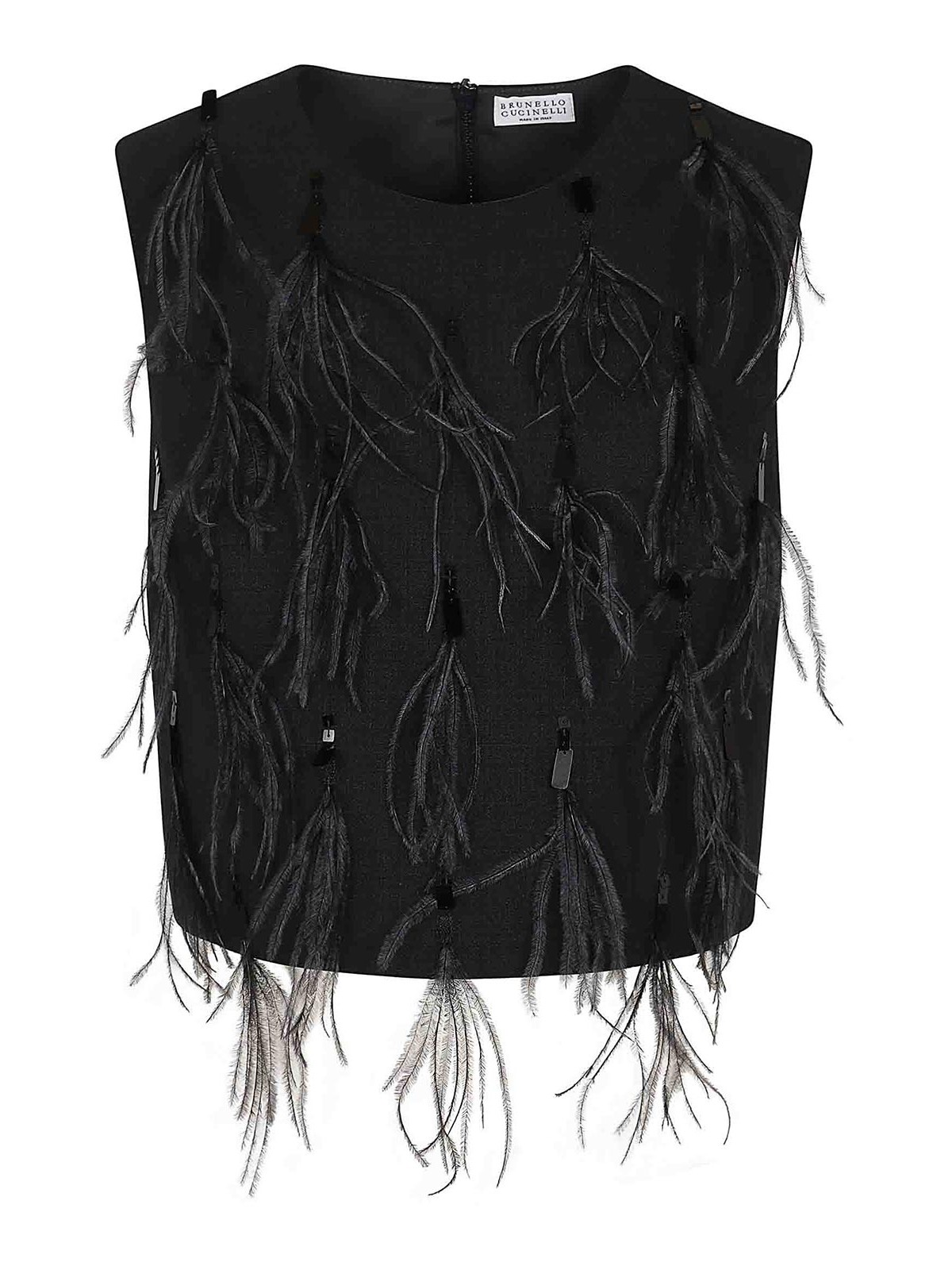 Top tropical en laine de luxe de Brunello Cucinelli, col rond, dos sans manches, fermeture éclair, coupe courte scintillante en plumes