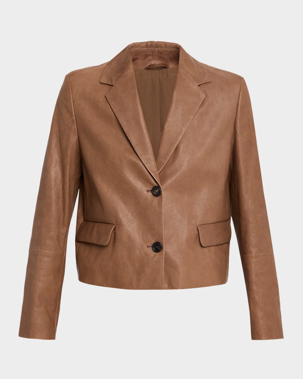 Brunello Cucinelli blazer jacket in vintage nappa leather Notch lapels; singlebreasted front Long sleeves; button cuffs Hip flap pockets Straight fit Cropped at the hip Button closure Lambskin leather Lining: Acetate/silk/polyester Made in Italy