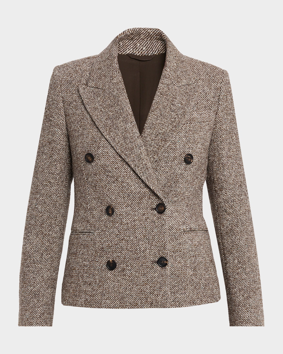 Expertly tailored and inspired by classic menswear, this woolblend blazer by Brunello Cucinelli exudes luxury with its mélange diagonal tweed fabric and precious monili embroidery Peak lapels; doublebreasted front Long sleeves; button cuffs Chest welt pocket Hip besom pockets Classic fit Midlength Virgin wool/silk/nylon/polyamide Made in Italy