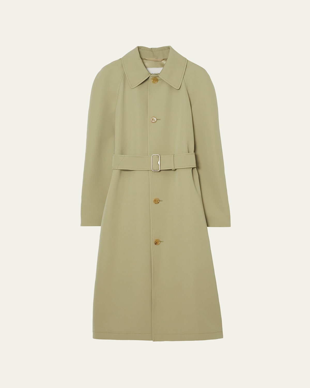 Burberry waterresistant gabardine trench coat Spread collar; button front Long sleeves; buttontab cuffs Side welt pockets Bshaped buckle belt Regular fit Wool Dry clean, professional cleaning recommended Made in Poland