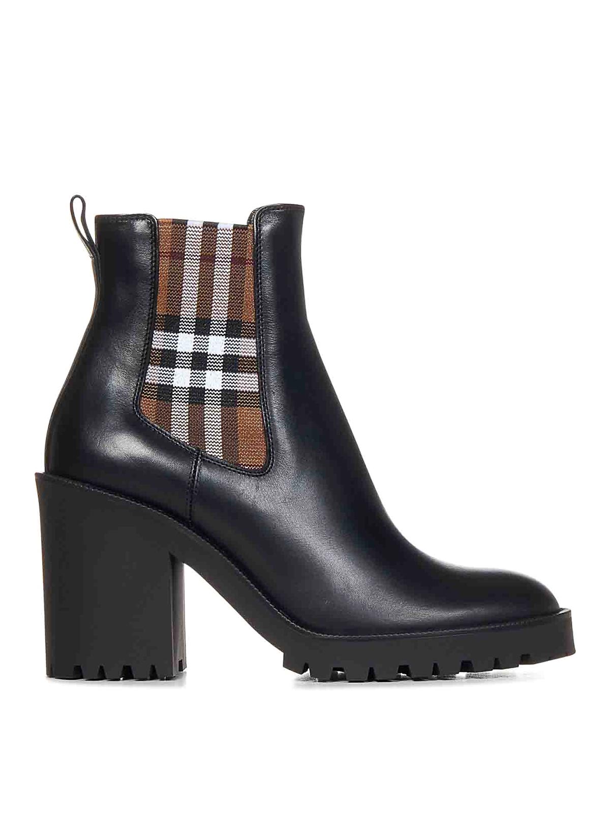 Languette latérale Burberry Check élastiquée à enfiler sur le bout en amande sur le bloc arrière avec bande de roulement dentelée, longueur du haut de la botte, hauteur du haut, mm, couleur noire et